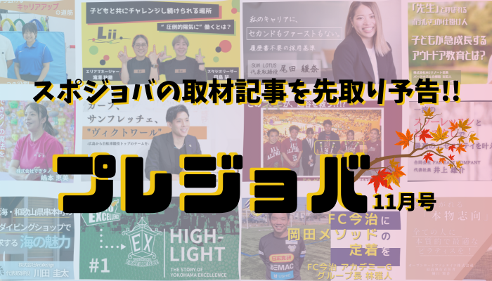いつもスポジョバをご利用いただき、誠にありがとうございます!ただの求人紹介サイトではないところが特徴のスポジョバでは、スポーツ業界で働く人のリアルな声を絶賛お届け中です。公開予定の取材記事を先駆けて予告する「プレジョバ」の第6回目。11月のラインナップをご紹介するとともに、記事の本公開を前にお楽しみください!