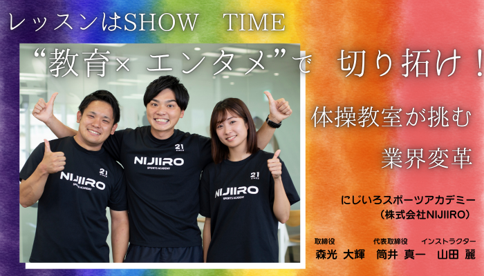 子どもたちの未来を育む教育の場として体操教室「にじいろスポーツアカデミー」を運営する株式会社NIJIIRO。運動を通して子どもたちに自信をつけ、教育業界に新しい視点をもたらす取り組みを続けています。今回は同社代表の筒井真一さん、立ち上げメンバーの森光大輝さん、そして今年4月に入社し、指導者としてフレッシュに活躍されている山田麗さんにお話を伺い、「楽しい」と「学び」を両立させるにじいろスポーツアカデミーの想いを紐解きました。
