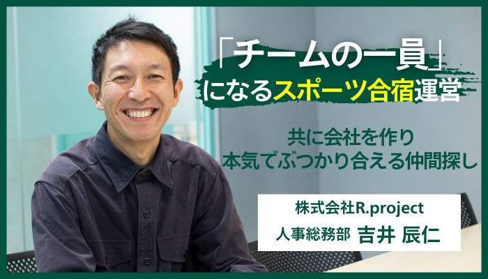 今回は、スポーツに打ち込むチームを一緒に支え、その成長や団結を後押しする「合宿事業」にフォーカス。「チームの一員」となる現場のやりがいと、それを支えるためのキャリア制度。スポーツの感動の裏側で人と組織の成長を両輪で支えるR.projectで人事を担当されている吉井辰仁さんにお話を伺いました。