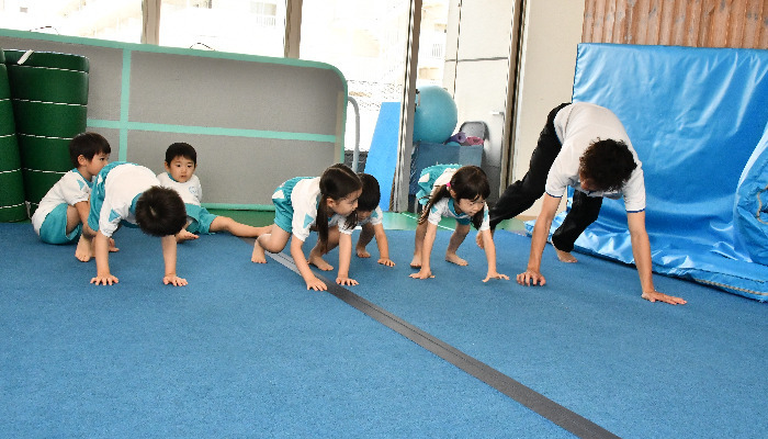 マット、鉄棒、縄跳び、ボールなどいろいろな種目を総合的に運動していきます。