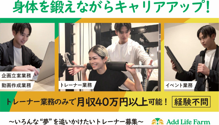 当グッドライフジムを運営する私たち「Add Life Farm」には、「人生という農場に多種多様な種を加え、自分だけの農場を作ろう。それが自分の財産になる。会社は、それをサポートする」という理念が込められています。今回は業務委託での募集ですが、あなたに対して「今働いている人の未来が明るくなってくる」ことを真剣に考えています。