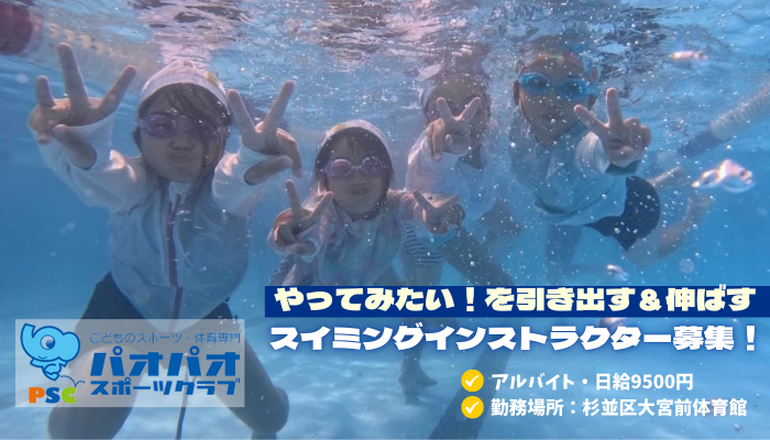今回は杉並区大宮前体育館で開催している「パオパオクラブ大宮前」でのスイミング指導をサポートいただけるメンバーを募集します。