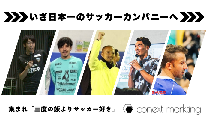 私たちConext Marktingは「日本一のサッカーカンパニー」を目指し、Jクラブや元代表選手たちとタッグを組んだイベント運営や企画営業、採用支援などを幅広く展開。2021年の会社設立以来、急速に事業拡大をしています。
